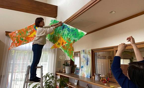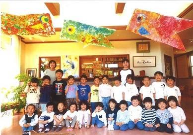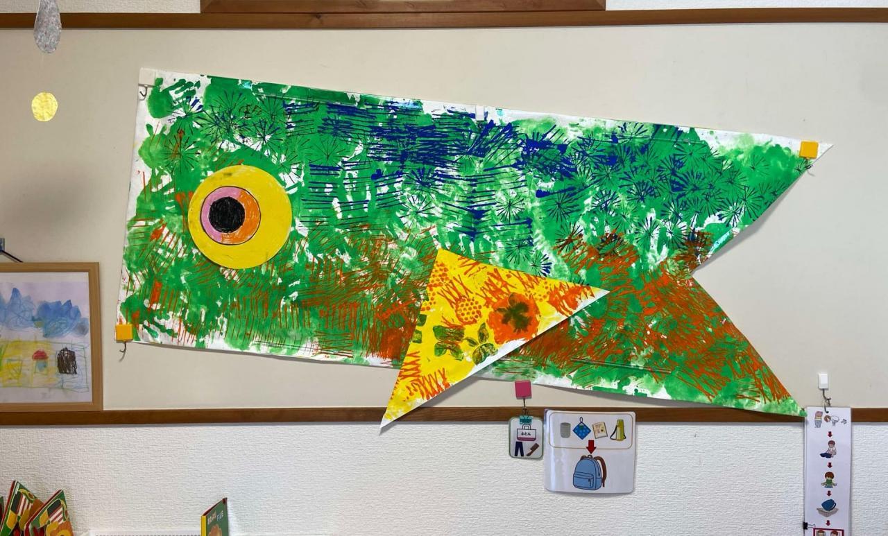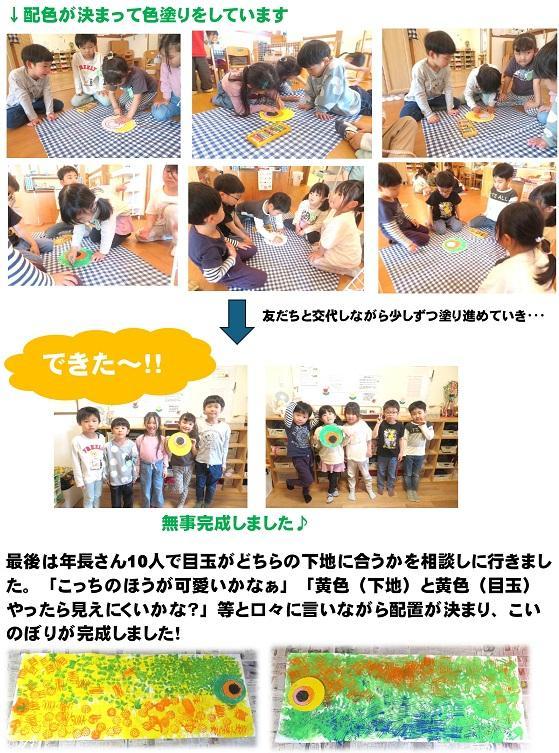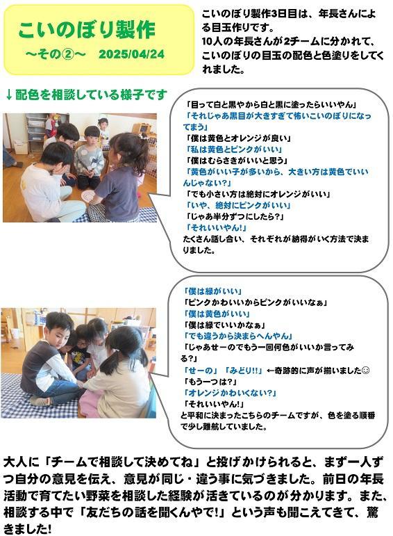 最後は年長さん10人で目玉がどちらの下地に合うかを相談しに行きました。「こっちのほうが可愛いかなぁ」「黄色(下地)と黄色(目玉)やったら見えにくいかな?」等と口々に言いながら配置が決まり、こいのぼりが完成しました!