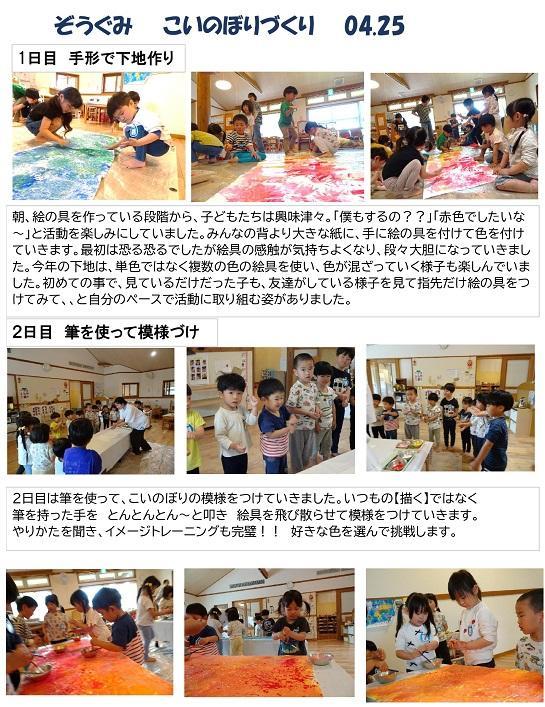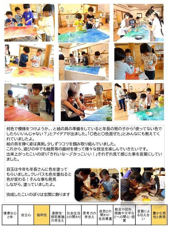 れていましたよ。絵の具を弾く姿は真剣。少しずつコツを掴み取り組んでいました。これから、遊びの中でも絵具等の画材を使って様々な技法を楽しんでいきたいです。出来上がったこいのぼり「きれいな~」「かっこいい!」それぞれ見て感じた事を言葉にしていました。