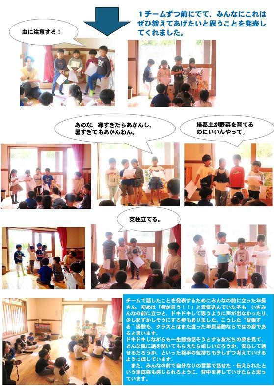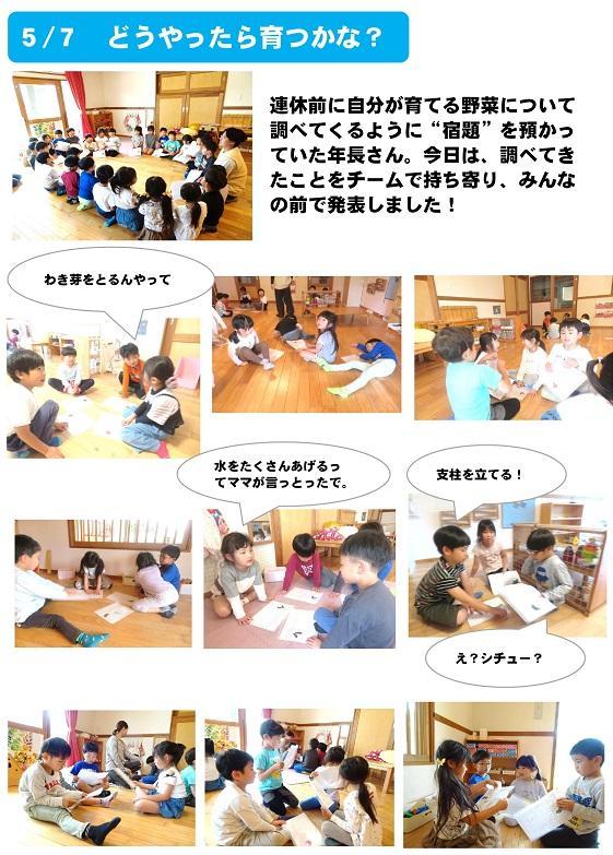 連休前に自分が育てる野菜について調べてくるように“宿題”を預かっていた年長さん。今日は、調べてきたことをチームで持ち寄り、みんなの前で発表しました。
