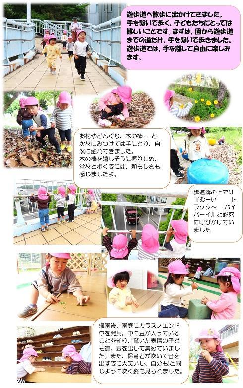 遊歩道へ散歩に出かけてきました。手を繋いで歩く、子どもたちにとっては難しいことです。まずは、園から遊歩道までの道だけ、手を繋いで歩きました。遊歩道では、手を離して自由に楽しみます。