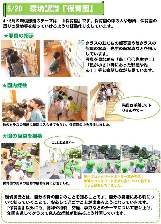 4・5月の環境認識のテーマは、『保育園』です。保育園の中の人や場所、保育園の周りの建物等を知っていけるような経験作りをしています。