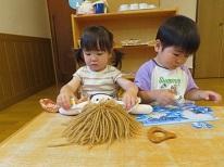 人形遊びに熱中する満2歳女児、上の服(半袖)を腕に通すことができていました。その服にはプッチンボタンがついており、留めることはまだ難しかったようでした。