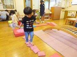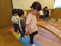 本日は雨で戸外遊びができなかったので、室内で運動遊びをして過ごしました。子どもたちは全員、興味をもって参加していました。1歳児は足元を見ながら慎重に渡ろうとして、ゆっくり進んで行くので、その後ろに2歳児がいると、どうしても後ろがつまってしまいます。