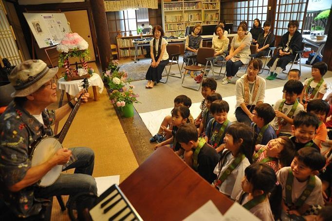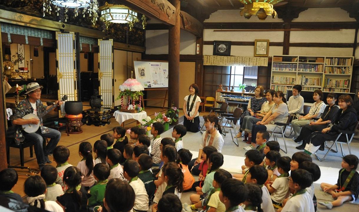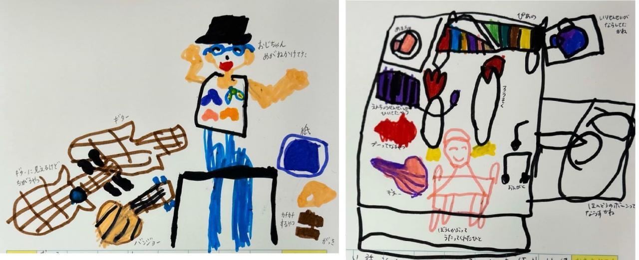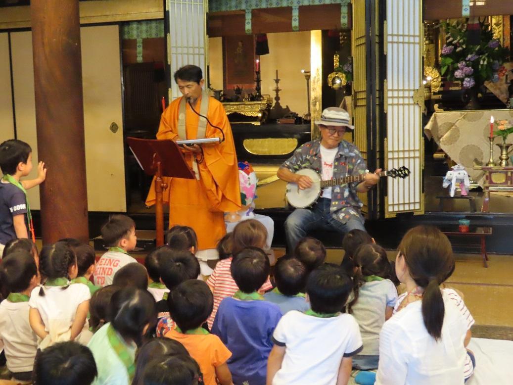 お説教が始まると、それぞれ口々に質問に対する答えを話したりし、興味をもって聞いている子が多かったように思います。知っている事・知らない事に対する子ども達の反応が顕著で、面白い。大西さんの演奏では、初めて見るバンジョーやマンドリンをまじまじと見つめる姿もあった。K児は、演奏に合わせて体を動かして表現しており、それを見てS児やT児も踊っていました。表現が豊かであった。