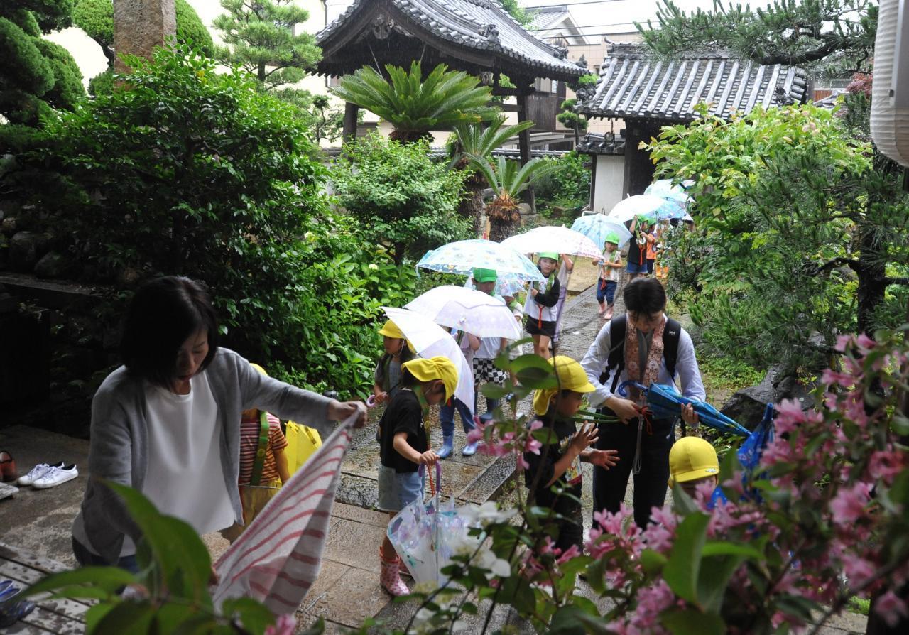 雨天のため予定を変更し、年中・年長児が本堂のはなまつりに参拝しました。一列に並んで傘をさして、道の色々な物に注意しながら歩くことは、少し難しいことでしたが、無事に到着することが出来ました。傘を差すだけで自分の身体より一周り余分に意識を拡げる必要がありました。あまりこういう経験の少ない子ども達は、友達や壁に当たりながら、だんだんとスムーズに歩くこつを掴めていました。<ぞう組クラス日誌より>
