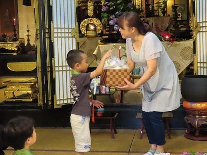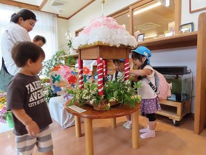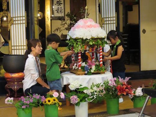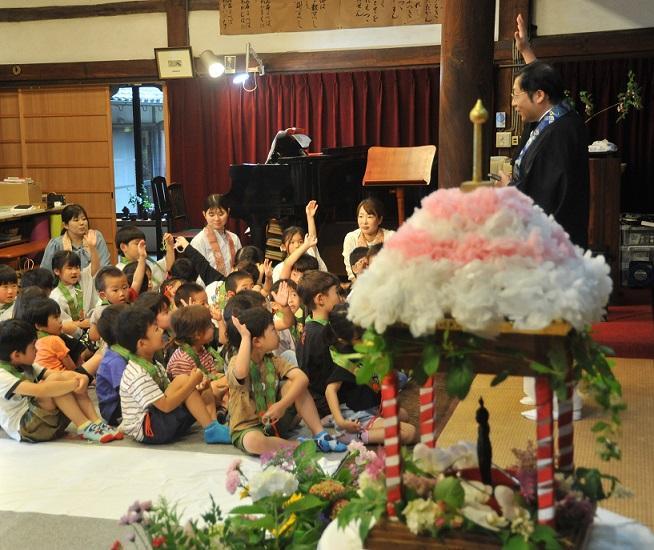 前日から年長児の役割(献灯等)があたっている子たちにはそのことを伝えており、「白いやつつけるん?」とケープをつけることを楽しみにしている様子でした。いよいよ花まつりが始まり、中央の白布を歩く時には少し緊張している様子もありましたが、堂々と仕事を果たせました。