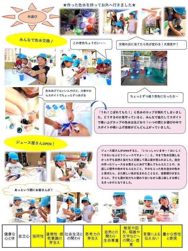 ジュース屋さんがOPEN すると、「いらっしゃいませ~!おいしくてきれいなぶどうジュースですよ~!」と、今まで色水交換しなかった子も自然と友だちと交換して遊ぶ姿が見られました。自分の作ったジュースをお客さんにあげて喜んでもらえたことや、お返しに相手の色水をもらえたこと、そのもらった色を自分の色水と混ぜたら、また新しい色が生まれたことなど、役割遊びがまたさらに、子ども達が友だちと関わり合いながら遊ぶ楽しさを感じるきっかけとなりました。
