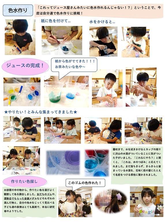 「これってジュース屋さんみたいに色水作れるんじゃない!?」ということで、今度は自分達で色水作りに挑戦!