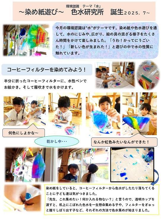 今月の環境認識は”水”がテーマです。染め紙や色水遊びを通して、水のにじみや、 広がり、絵の具の混ざる様子をたくさん時間をかけて楽しみました。「うわ!かってにうごいた!」「新しい色が生まれた!」と遊びの中で水の性質に触れています。