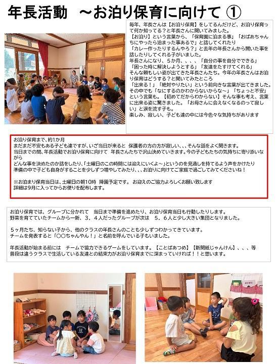 ※お泊まり保育当日は、土曜日の朝10時降園予定です。お迎えのご協力よろしくお願い致します
