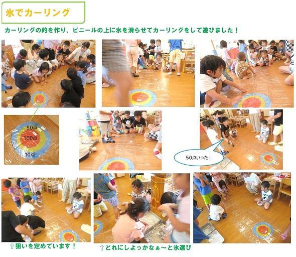 カーリングの的を作り、ビニールの上に氷を滑らせてカーリングをして遊びました!