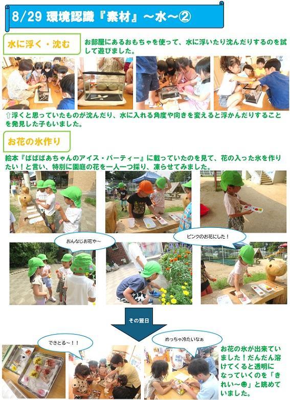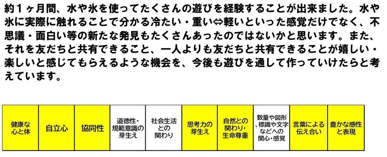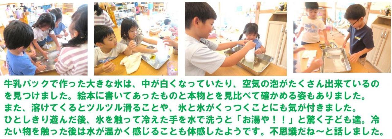 ひとしきり遊んだ後、氷を触って冷えた手を水で洗うと「お湯や!!」と驚く子ども達。冷たい物を触った後は水が温かく感じることも体感したようです。不思議だね~と話しました。