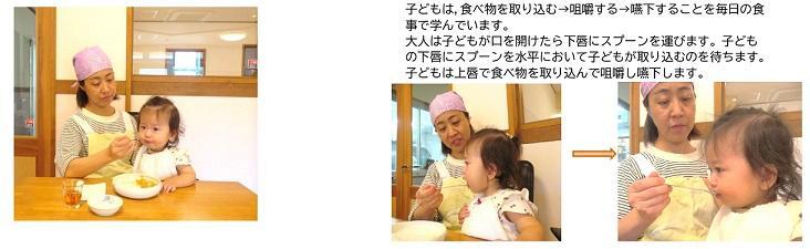 乳幼児期から発達段階に応じて豊かな食の体験を積み重ねていくことで健康な身体と心が育っていきます。子どもが食事をおいしく楽しく食べることができるように食事環境を考え、コミュニケーションを取りながら助けています。