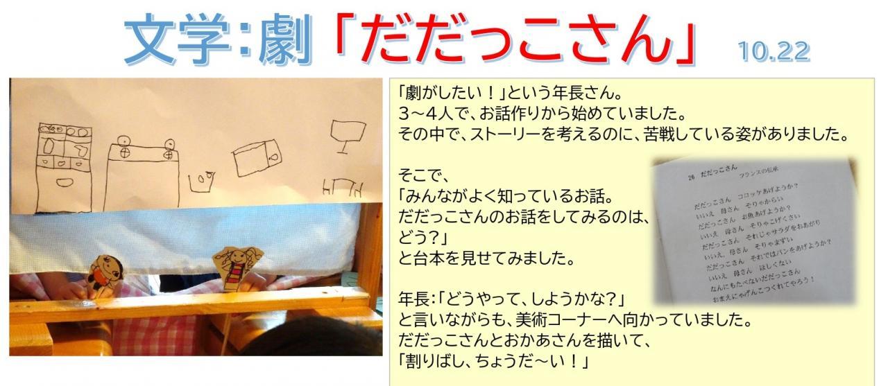 文学 詩・ごろ合わせ・お話など を消化する方法は、劇化 モチーフ遊び 、ほかの作品と組み合わせる、詩を聞いて踊る・動く、描画との統合などがあります。作品 お話 を聞くことだけでも子どもたちは、たくさんのファンタジーを働かせ、たくさんの感情を動かしますが、このような遊びの中で子どもたちは、より作品を味わっています。