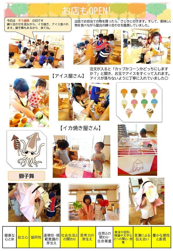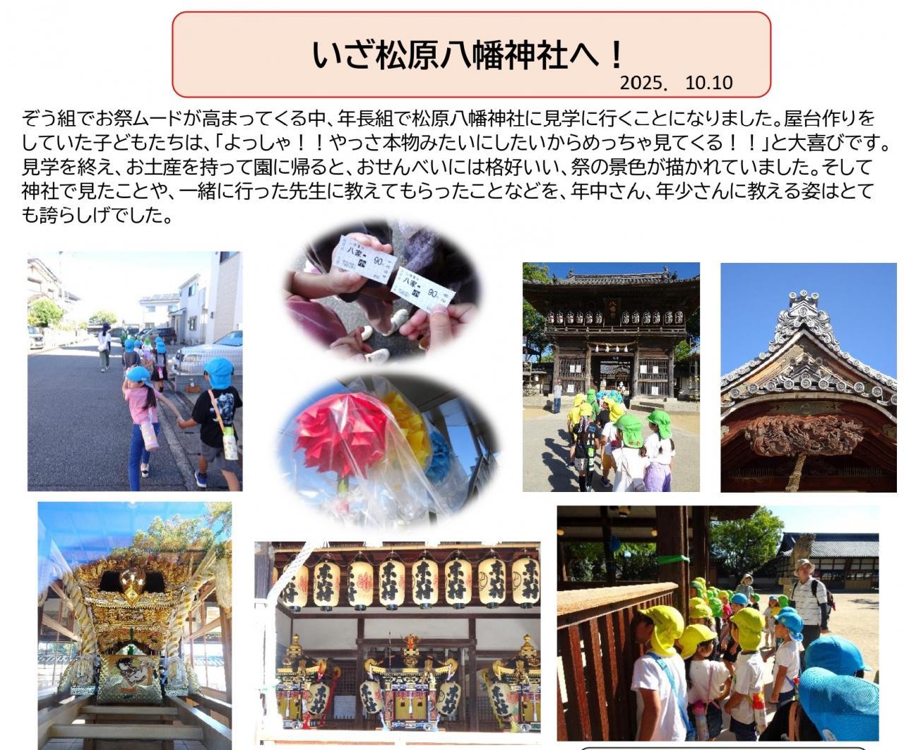 ぞう組でお祭ムードが高まってくる中、年長組で松原八幡神社に見学に行くことになりました。屋台作りをしていた子どもたちは、「よっしゃ!!やっさ本物みたいにしたいからめっちゃ見てくる!!」と大喜びです。