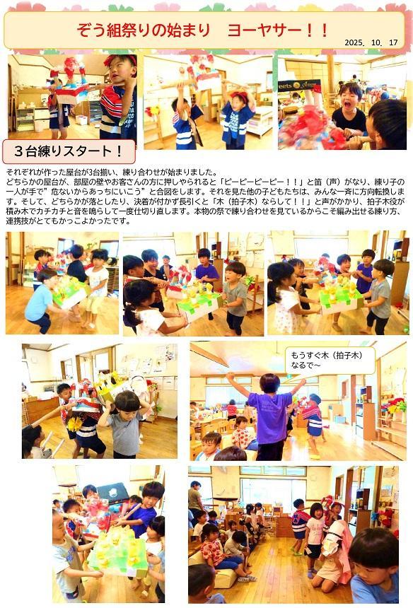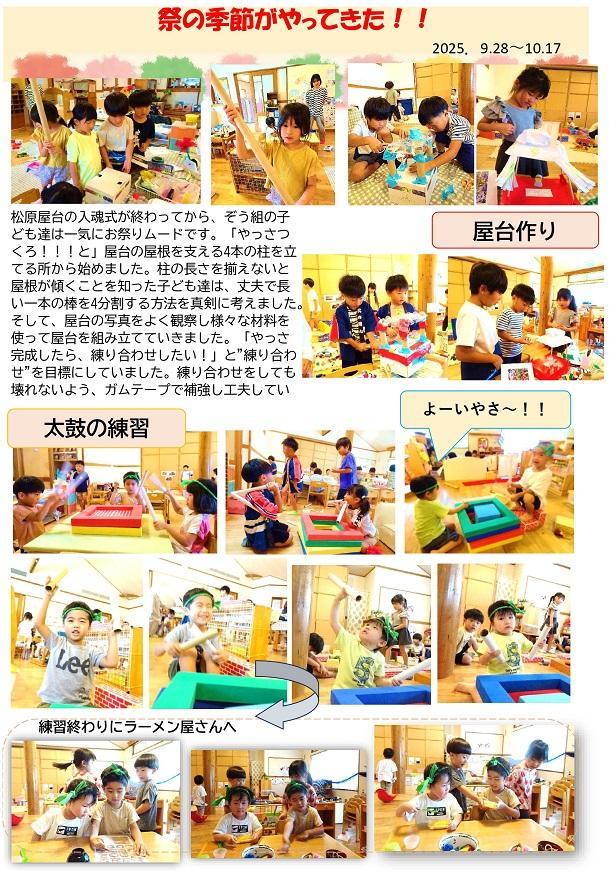 松原屋台の入魂式が終わってから、ぞう組の子ども達は一気にお祭りムードです。「やっさつくろ!!!と」屋台の屋根を支える4 本の柱を立てる所から始めました。柱の長さを揃えないと屋根が傾くことを知った子ども達は、丈夫で長い一本の棒を4 分割する方法を真剣に考えました。そして、屋台の写真をよく観察し様々な材料を使って屋台を組み立てていきました。「やっさ完成したら、練り合わせしたい!」と 練り合わせ を目標にしていました。練り合わせをしても壊れないよう、ガムテープで補強し工夫していました。