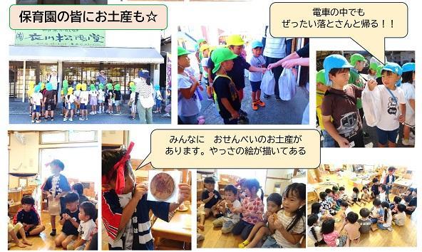 見学を終え、お土産を持って園に帰ると、おせんべいには格好いい、祭の景色が描かれていました。そして神社で見たことや、一緒に行った先生に教えてもらったことなどを、年中さん、年少さんに教える姿はとても誇らしげでした。