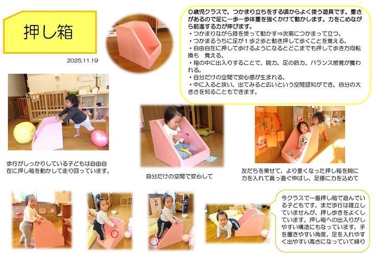 今クラスで一番押し箱で遊んでいる子どもです。まだ歩行は確立していませんが、押し歩きをよくしています。押し箱への出入りがしやすい構造にもなっています。手を置きやすい角度、足を入れやすく出やすい高さになっていて繰り返し遊んでいます。