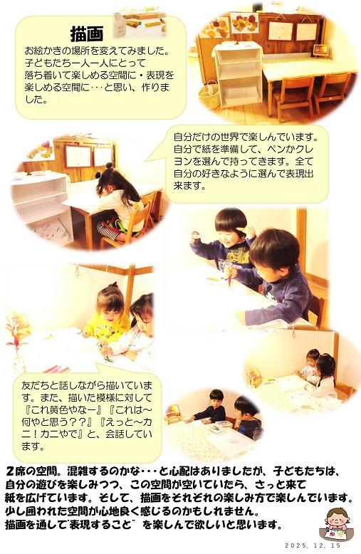 お絵かきの場所を変えてみました。子どもたち一人一人にとって落ち着いて楽しめる空間に・表現を楽しめる空間に・・・と思い、作りました。