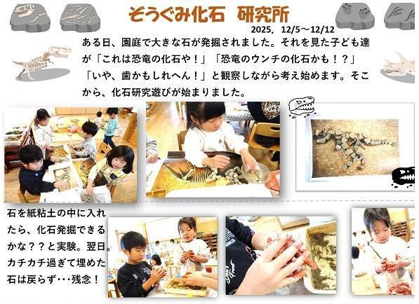 ある日、園庭で大きな石が発掘されました。それを見た子ども達が「これは恐竜の化石や!」「恐竜のウンチの化石かも!?」「いや、歯かもしれへん!」と観察しながら考え始めます。そこから、化石研究遊びが始まりました。