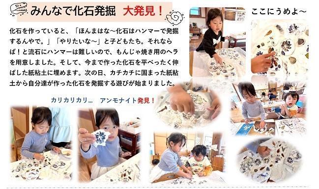 化石を作っていると、「ほんまはな~化石はハンマーで発掘するんやで。」「やりたいな~」と子どもたち。それならば!と流石にハンマーは難しいので、もんじゃ焼き用のヘラを用意しました。そして、今まで作った化石を平べったく伸ばした紙粘土に埋めます。