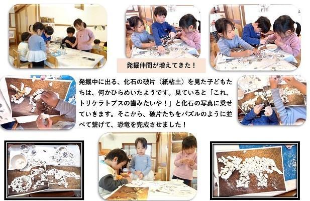 発掘中に出る、化石の破片(紙粘土)を見た子どもたちは、何かひらめいたようです。見ていると「これ、トリケラトプスの歯みたいや!」と化石の写真に乗せていきます。そこから、破片たちをパズルのように並べて繋げて、恐竜を完成させました!