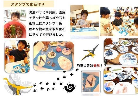 洗濯バサミや貝殻、園庭で見つけた葉っぱや石を紙粘土にスタンプ! 色々な物の型を取り化石に見立てて遊びました。