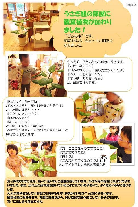 観葉植物に興味をもち、実際に触れながら、同じ空間で日々過ごしている子どもたち。互いに癒し合う存在ですね。