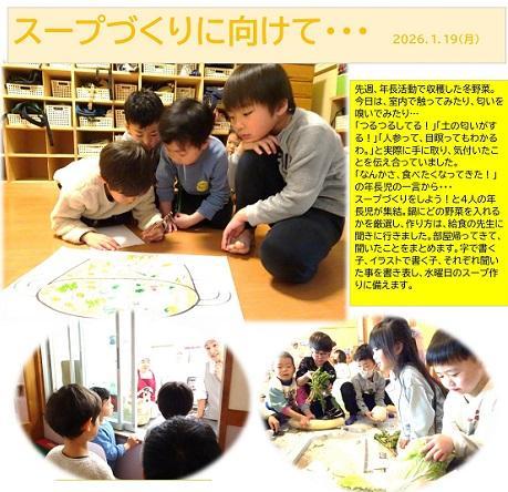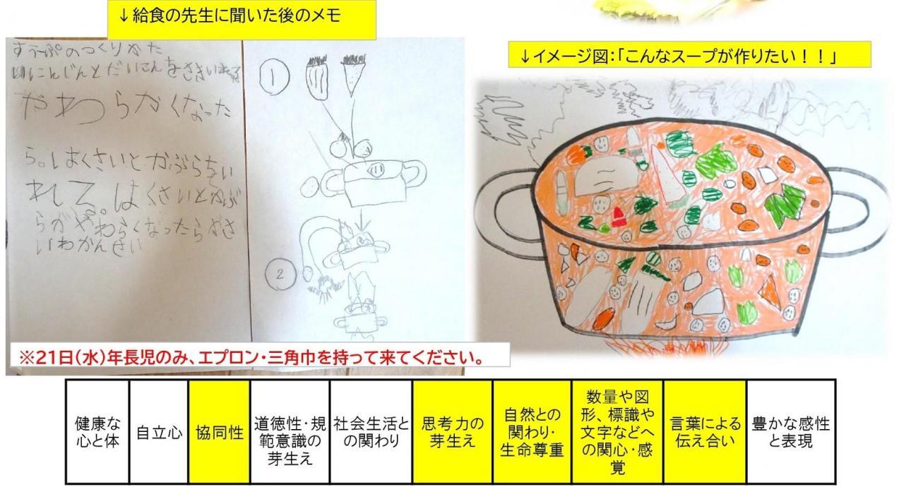 「なんかさ、食べたくなってきた!」の年長児の一言から・・・スープづくりをしよう!と4人の年長児が集結。鍋にどの野菜を入れるかを厳選し、作り方は、給食の先生に聞きに行きました。部屋帰ってきて、聞いたことをまとめます。字で書く子、イラストで書く子、それぞれ聞いた事を書き表し、水曜日のスープ作りに備えます。