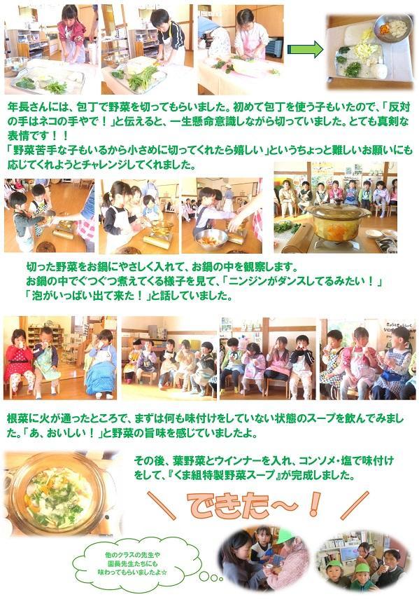 その後、葉野菜とウインナーを入れ、コンソメ・塩で味付けをして、『くま組特製野菜スープ』が完成しました。