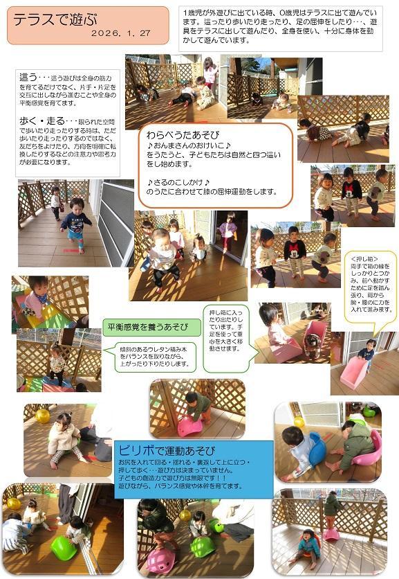 1歳児が外遊びに出ている時、0 歳児はテラスに出て遊んでいます。這ったり歩いたり走ったり、足の屈伸をしたり・・・、遊具をテラスに出して遊んだり、全身を使い、十分に身体を動かして遊んでいます。