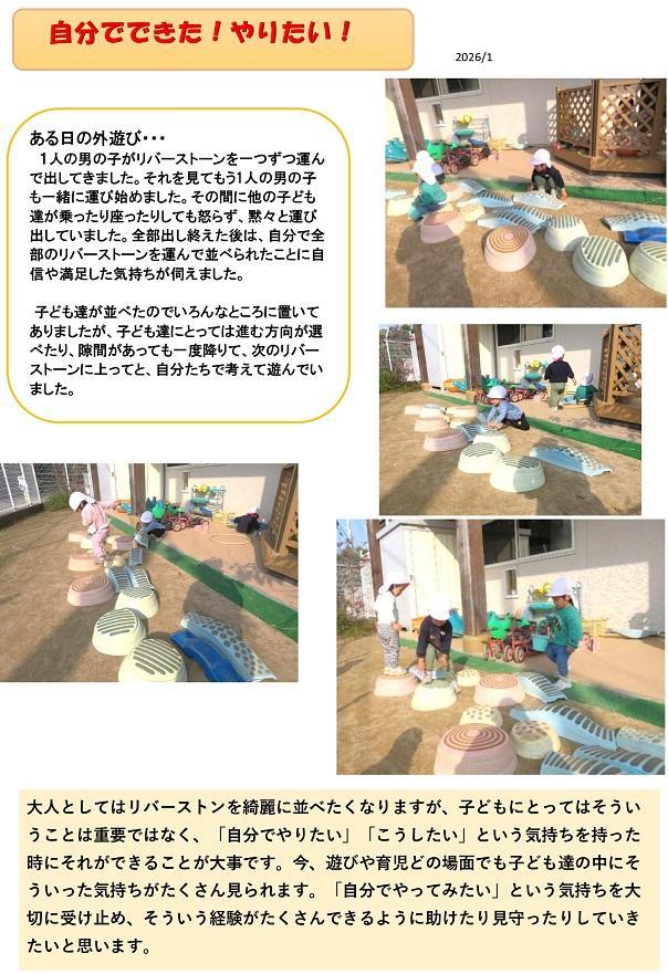 大人としてはリバーストンを綺麗に並べたくなりますが、子どもにとってはそういうことは重要ではなく、「自分でやりたい」「こうしたい」という気持ちを持った時にそれができることが大事です。今、遊びや育児どの場面でも子ども達の中にそういった気持ちがたくさん見られます。「自分でやってみたい」という気持ちを大切に受け止め、そういう経験がたくさんできるように助けたり見守ったりしていきたいと思います。