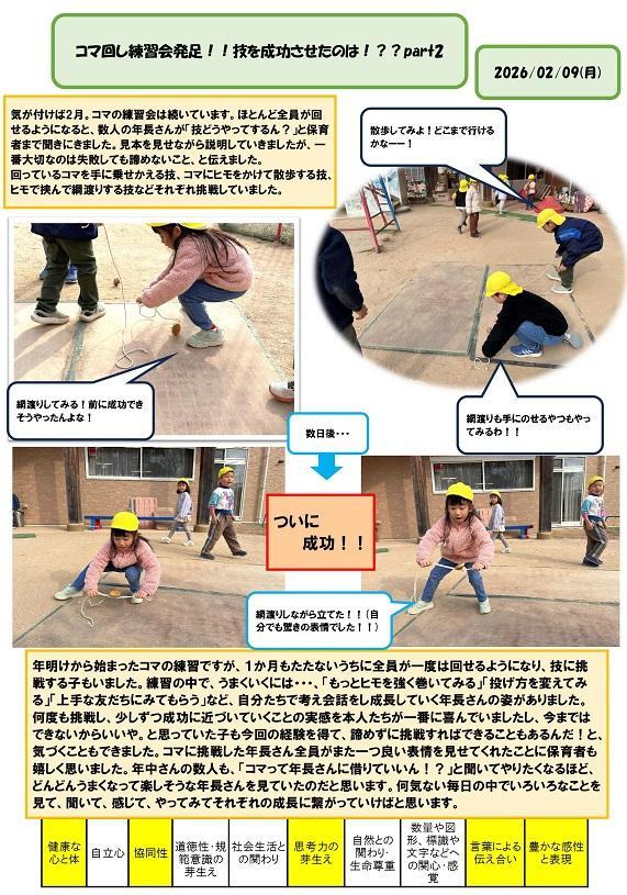 気が付けば2 月。コマの練習会は続いています。ほとんど全員が回せるようになると、数人の年長さんが「技どうやってするん?」と保育者まで聞きにきました。見本を見せながら説明していきましたが、一番大切なのは失敗しても諦めないこと、と伝えました。