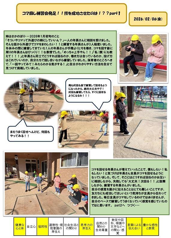年明けから始まったコマの練習ですが、1か月もたたないうちに全員が一度は回せるようになり、技に挑戦する子もいました。練習の中で、うまくいくには・・・、「もっとヒモを強く巻いてみる」「投げ方を変えてみる」「上手な友だちにみてもらう」など、自分たちで考え会話をし成長していく年長さんの姿がありました。何度も挑戦し、少しずつ成功に近づいていくことの実感を本人たちが一番に喜んでいましたし、今まではできないからいいや。と思っていた子も今回の経験を得て、諦めずに挑戦すればできることもあるんだ!と、気づくこともできました。コマに挑戦した年長さん全員がまた一つ良い表情を見せてくれたことに保育者も嬉しく思いました。年中さんの数人も、「コマって年長さんに借りていいん!?」と聞いてやりたくなるほど、どんどんうまくなって楽しそうな年長さんを見ていたのだと思います。何気ない毎日の中でいろいろなことを見て、聞いて、感じて、やってみてそれぞれの成長に繋がっていけばと思います。