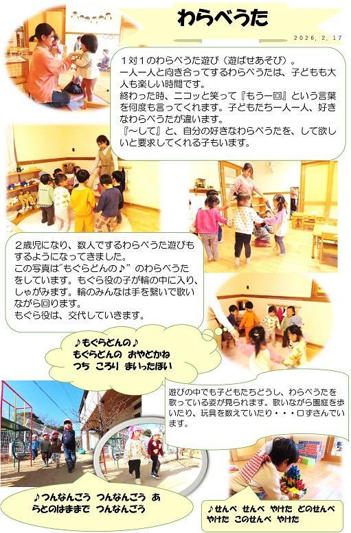 遊びの中でも子どもたちどうし、わらべうたを歌っている姿が見られます。歌いながら園庭を歩いたり、玩具を数えていたり・・・口ずさんでいます。