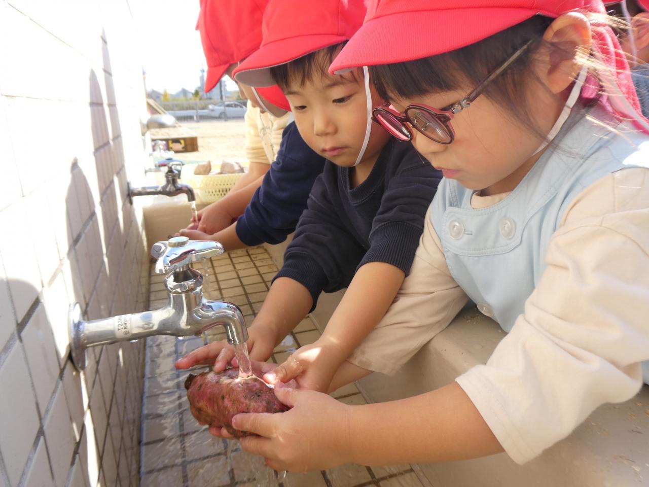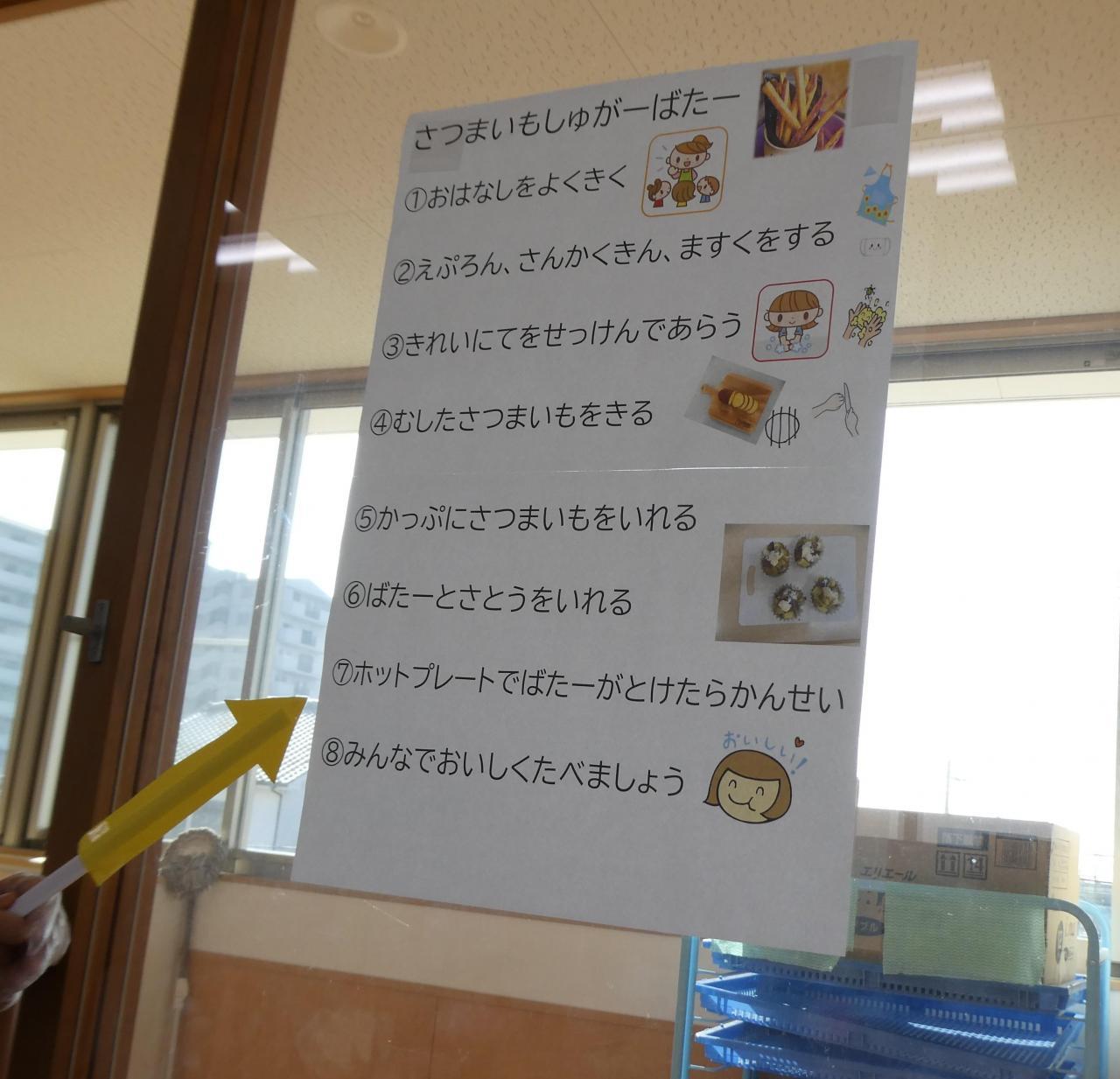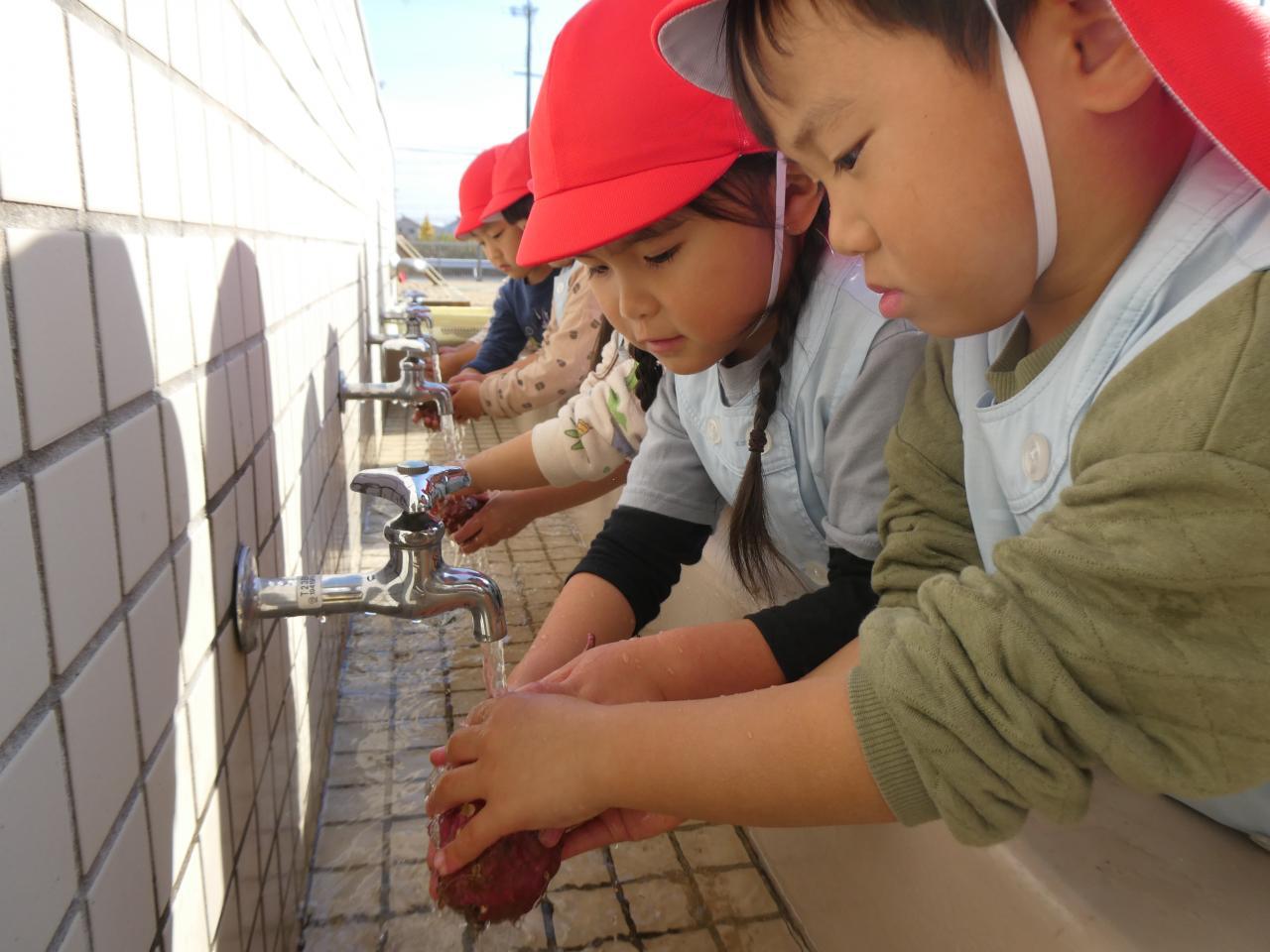 前日にはさつまいもを洗い、給食室の先生に「よろしくおねがいします!」と伝えに行きました😄