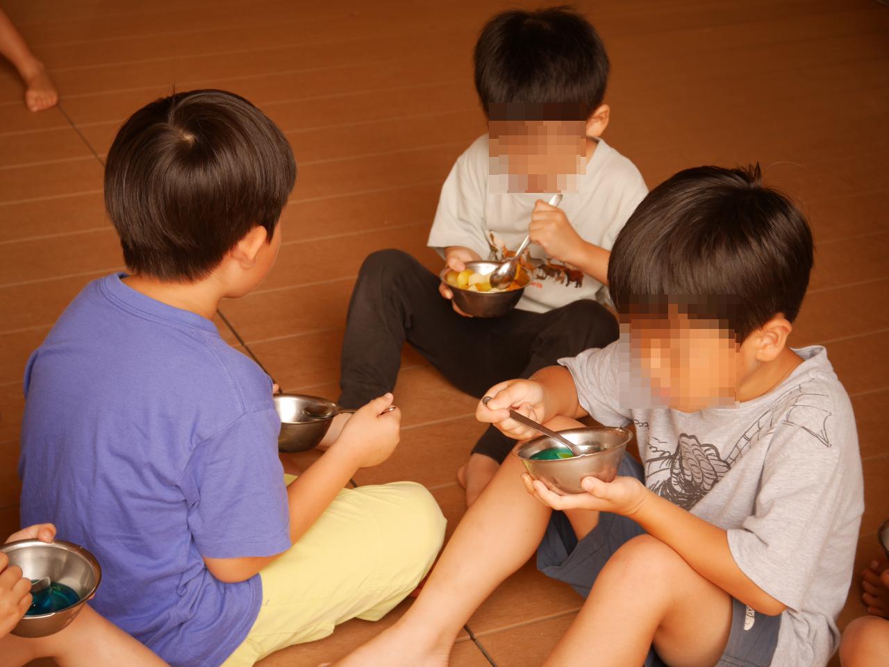 夏の風物詩とも言えるかき氷をにじ組のクッキングで先日行いました。メロン味、レモン味、ブルーハワイ味の3色のうち、好きな味をかけて果物トッピングして特性にじ組かき氷の完成です♪ ウッドデッキでおやつに食べ「体が冷える~」「おいしい~」と何度もおかわりをする子もいました。