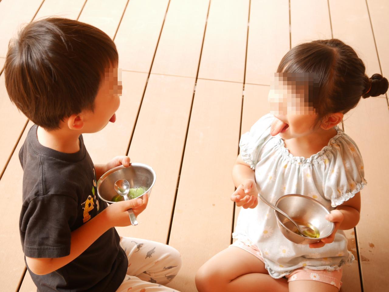 また、かき氷にかけたシロップの色によって舌の色が変わることに気づき、お友達と顔を見合わせて、「べー」っと舌を出して楽しんでいました。