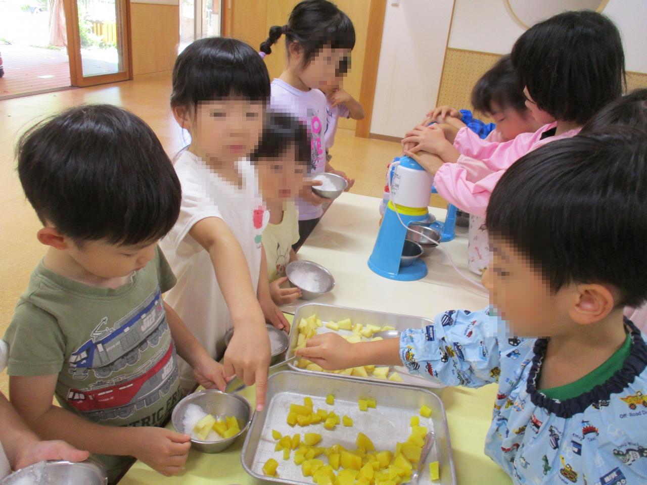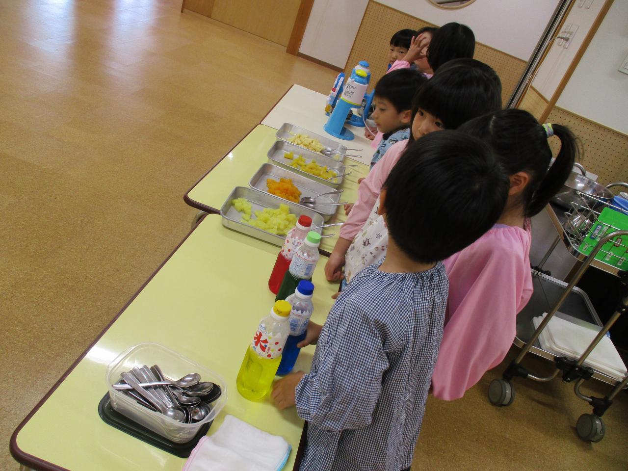 朝から「早くかき氷食べたいな~」と楽しみにしていた子どもたちです。夏ならではの楽しいクッキングとなりました。