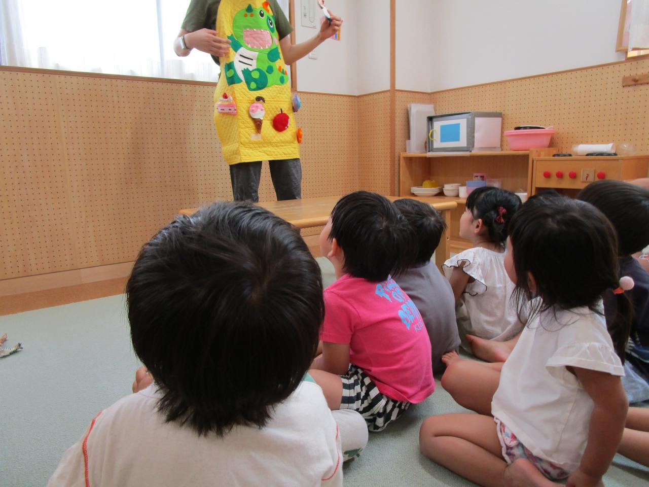 保育士からは出し物のプレゼントが!「今日は元気なお友達を連れてきたよ~」とやってきたのは、はらぺこ怪獣さんです。ケーキやアイス、飛行機まで食べてしまってさあ大変、、、みんな心配していましたが、お医者さんに直してもらって元気に帰っていくと、「ばいば~い」と笑顔で手を振る姿がかわいらしかったです。