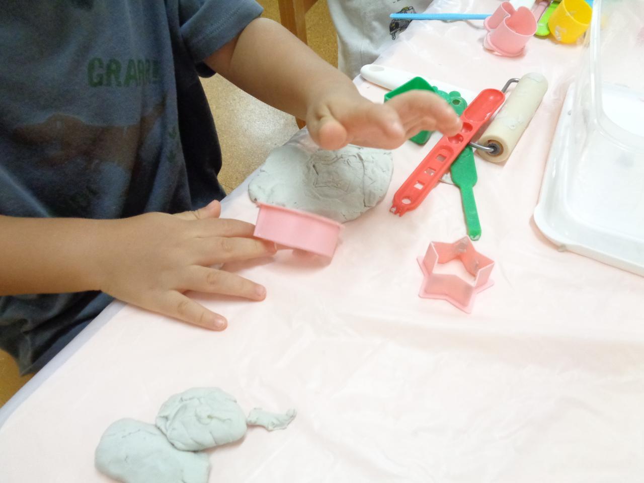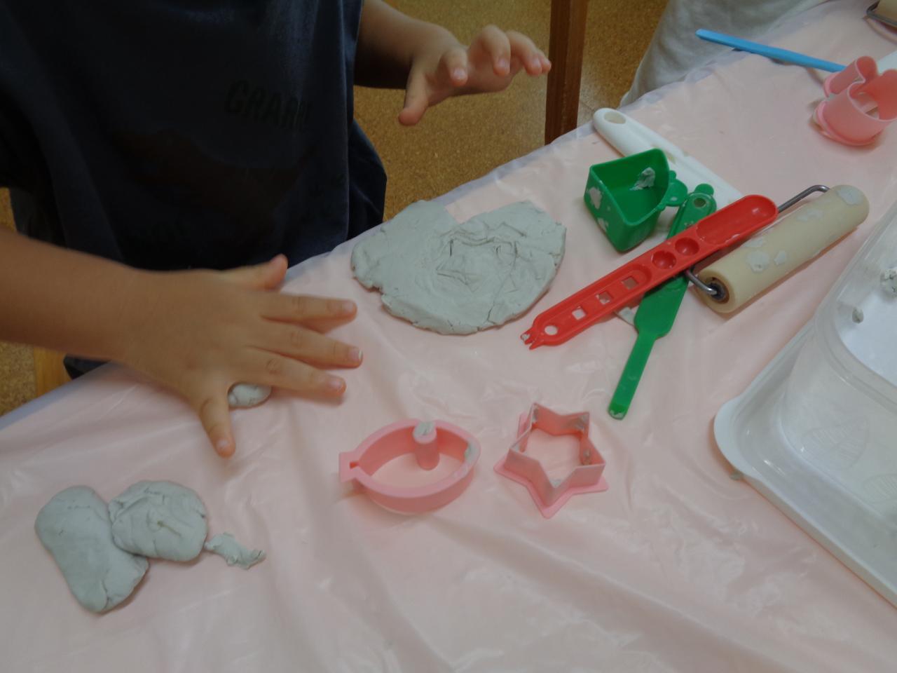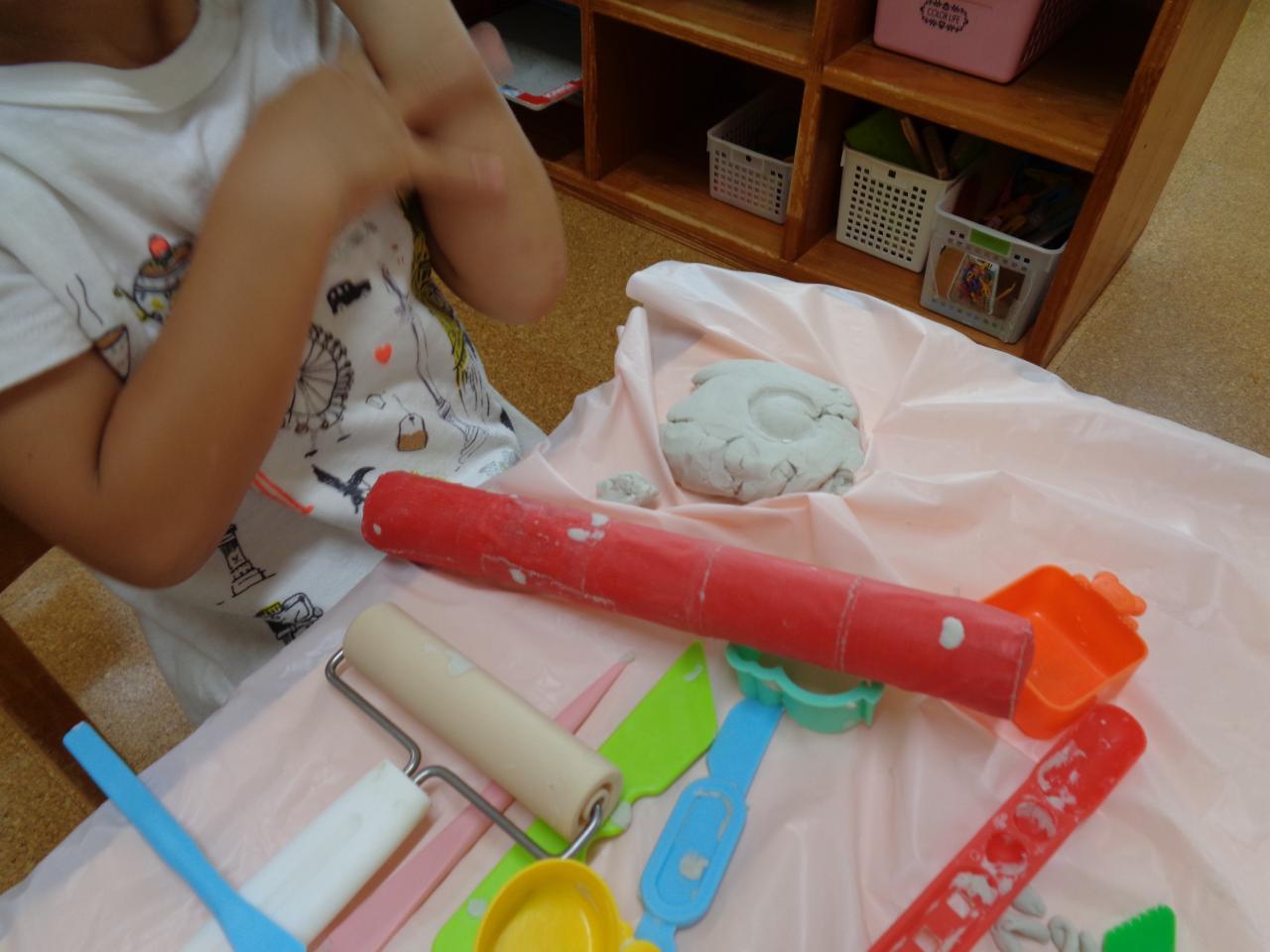 シャワーが終わり、室内でもゆっくりと過ごせる時間が出来たので少し前から粘土を出しています。初めて粘土に触れる子や、「これ、お家にもあるんだ~」と机の上で上手に伸ばしたりする子など、様々なリアクションを見せてくれる子ども達!