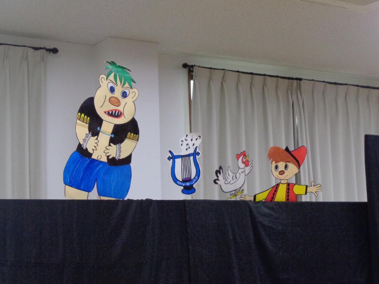 各家庭からお持ち頂いた野菜や果物を祭壇に飾り、毎日の食物が与えられていることに感謝のお祈りを捧げました。続いて収穫感謝祭の由来についての話を聞き、職員のペープサート「ジャックと豆の木」を見ました。巨人が出てくる場面ではドキドキしていた子どもたち。ジャックが無事にお母さんと幸せに暮らせることになるとホッと胸をなでおろしていました。みんな、おもしろかったようで、しばらく話していたほどです。