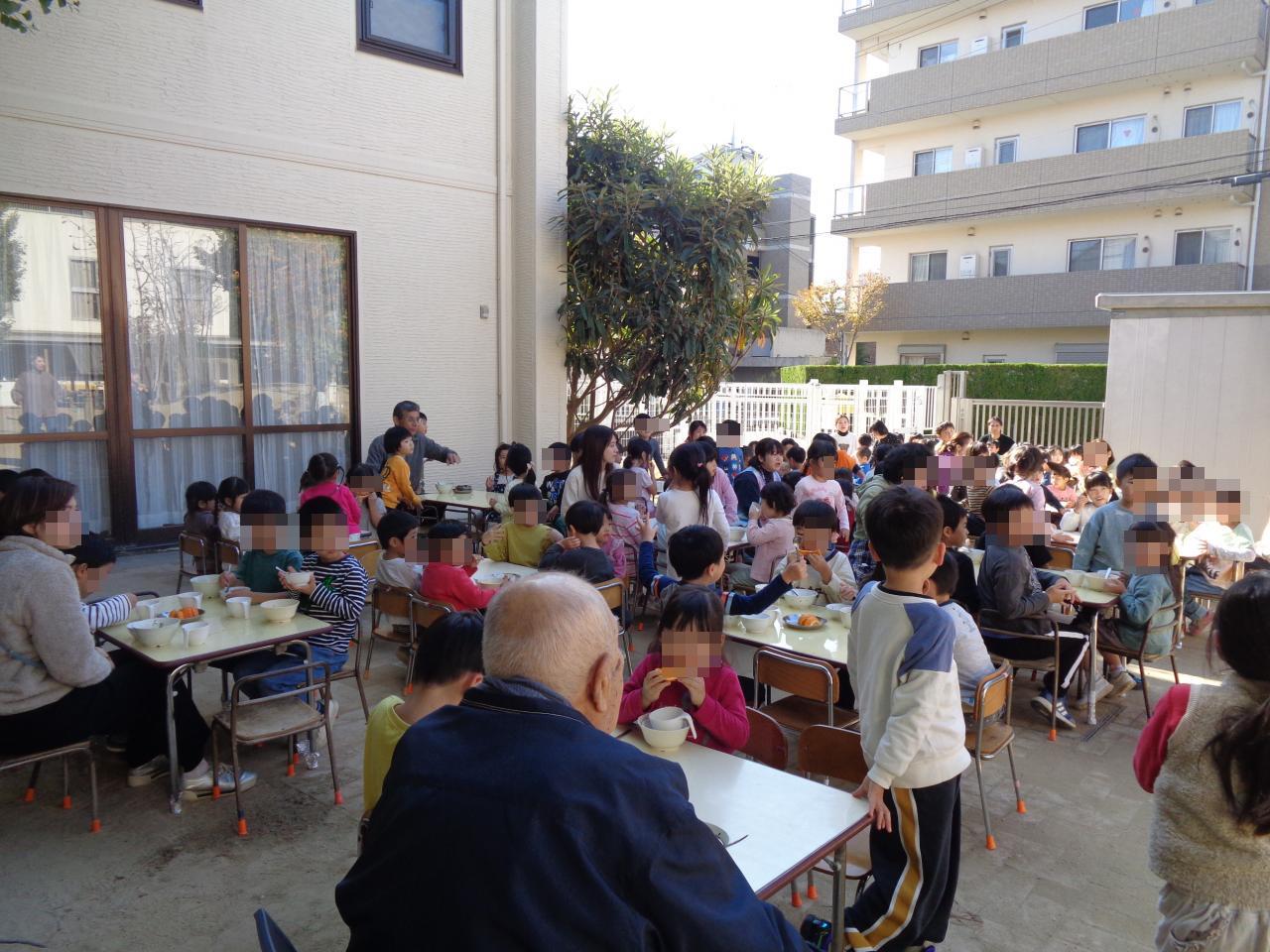野菜は翌20日に、豚汁パーティーを開催。各クラス、赤さんは葉野菜をちぎり、黄さん青さんは根菜などを切ってくれました。みんなで作った豚汁は、とても良いお天気の下、園庭で頂きました。普段一緒に食べていない他のクラスの子たちと同じテーブルになり、「おいしい!」「これ、ちぎったよね!」「玉ねぎ切ったんだよ!」と格別においしく頂いて、おかわりの行列もできていました。とても素敵な食事時間となりました。