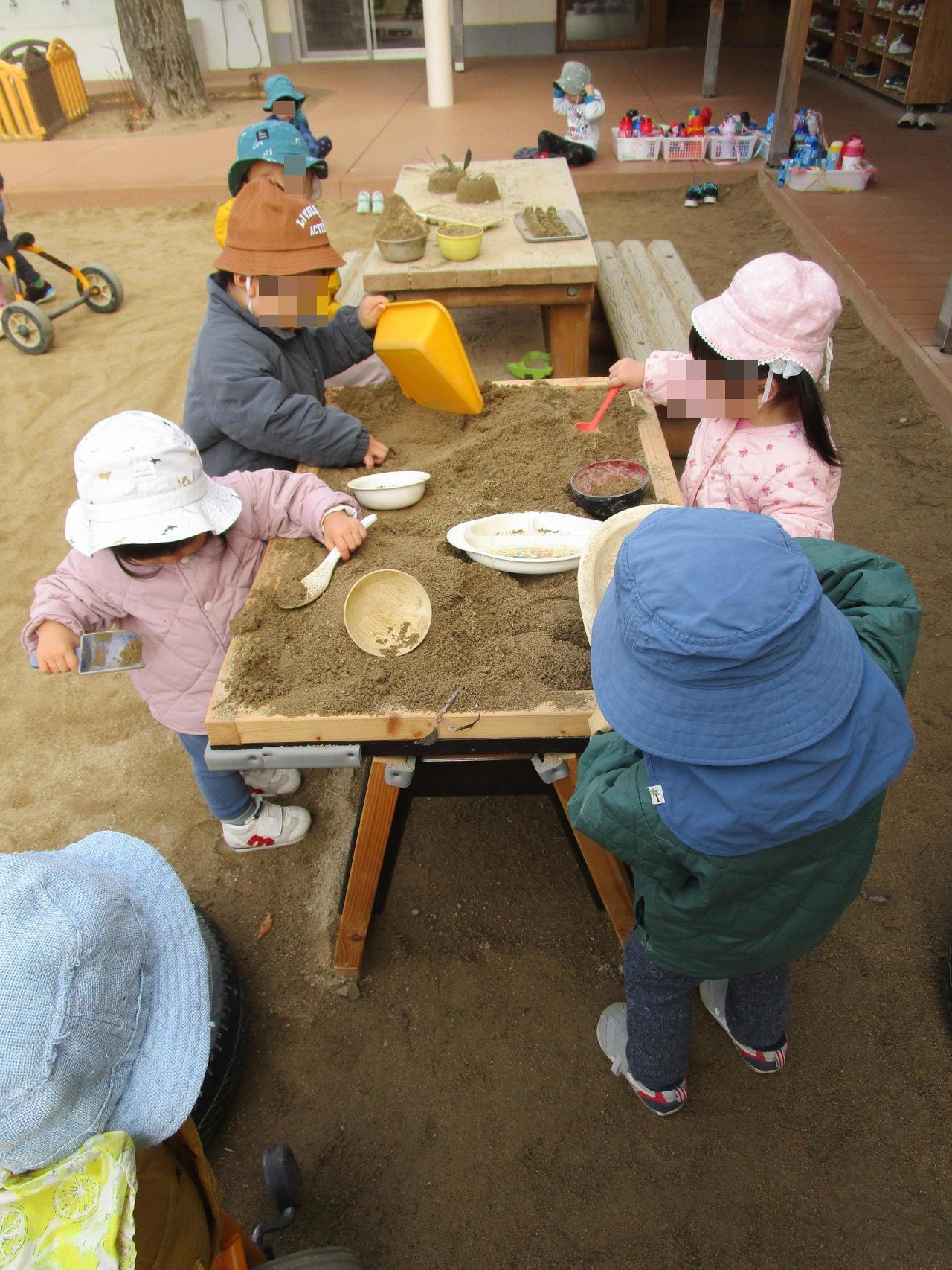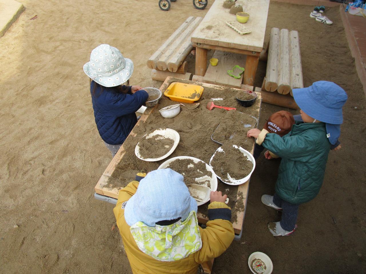 少しずつ、日中は暖かい日も増えてきましたね。でも、子どもは風の子!とはよく言ったように、園庭を走り回って、暑い~!と上着を脱いで風を感じたり、冷え込む日でも夢中で砂遊びをしたりと、春が待ち遠しい大人とは違い、冬を満喫しています😄