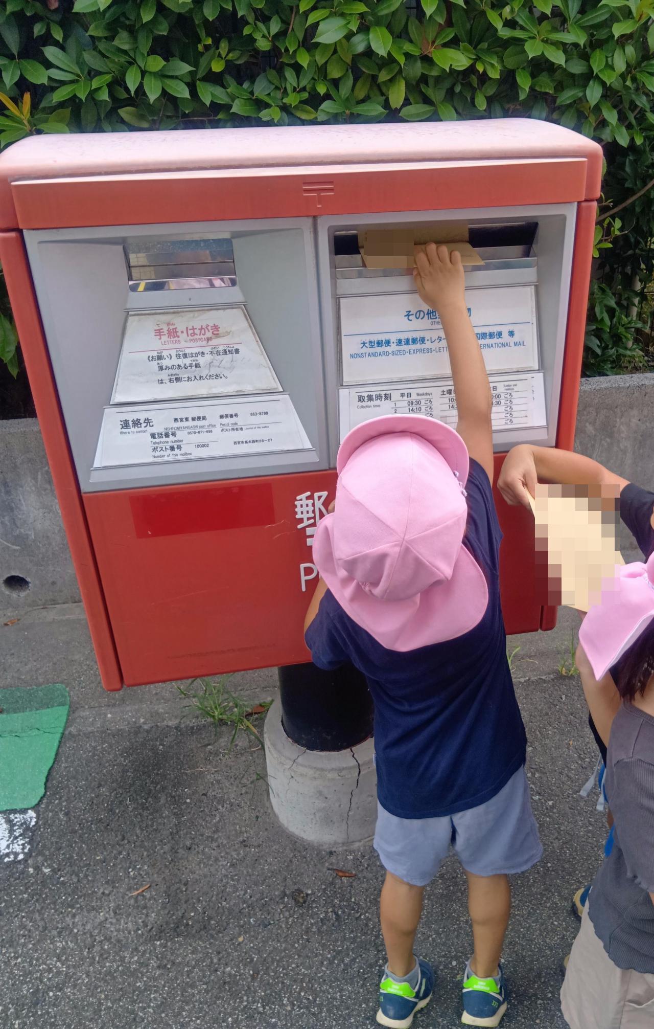 「ちゃんと届きますように!」と言いながら、投函していたにじ組の子どもたち。この連休中または連休明けに祖父母様の元に世界で1つしかない写真立てが無事届きますように✨