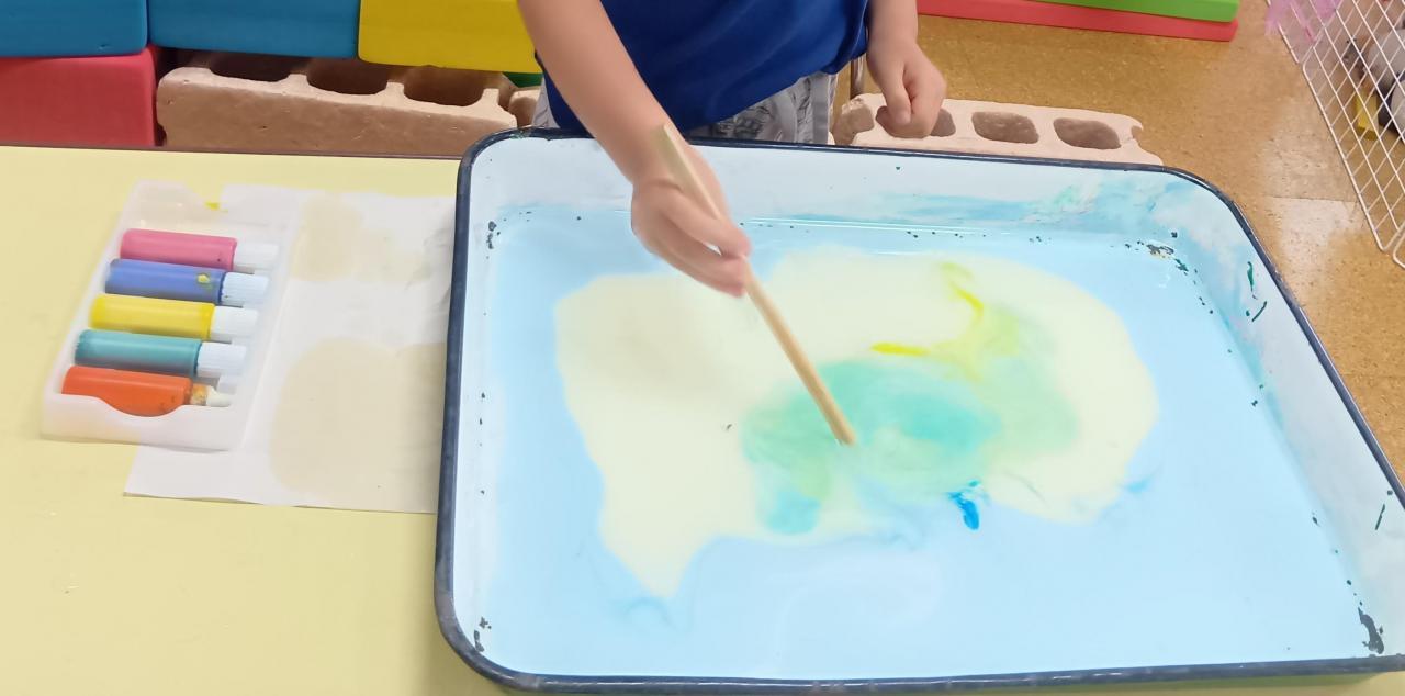 今年度にじ組は、子どもたちからの要望で「マーブリング」で写真立てを作りました。マーブリングは水をはじく専用の絵具を水を張ったバットに1滴落とし、混ぜてマーブル模様を作り、そこに画用紙をそっと置いて、ゆっくり引き上げるとその模様が画用紙に写し取られるというものです。にじ組の子どもたちは、これを「魔法の絵具」と呼んでいるのですが、「おじいちゃん、喜ぶかな~」「おばあちゃん、びっくりするかな~」とウキウキしながらやっていました。