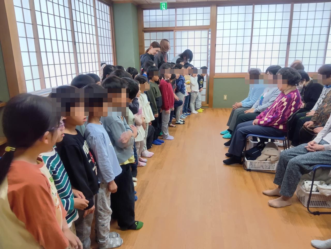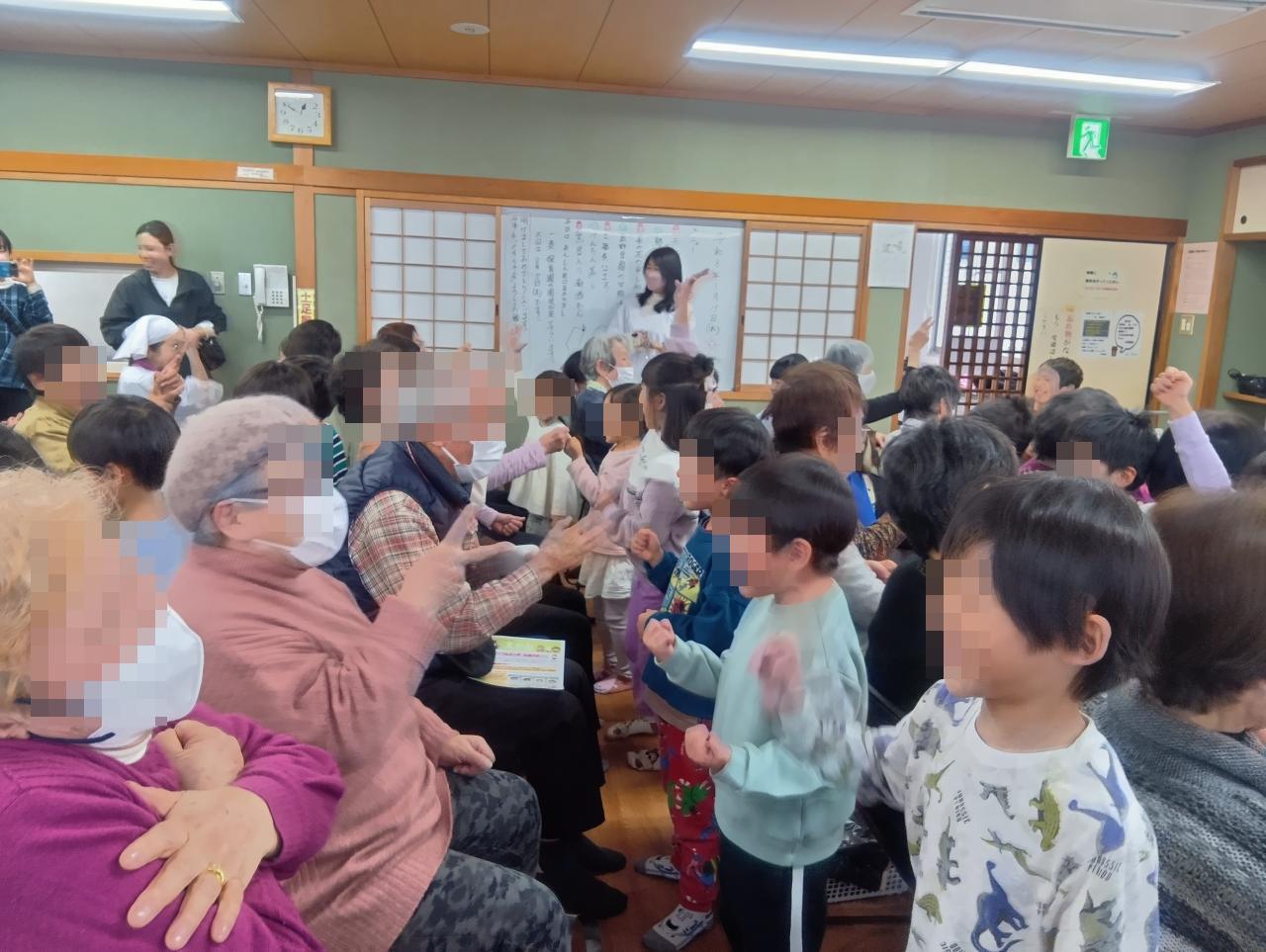 少し緊張している様子の子もいましたが、「ゆきやこんこん」のうたを一緒に歌ったり、「オモヤノモチツキ」「ヤナギノシタニハ」のわらべうたを一緒に楽しんだりしていると、皆の表情も和らいできました。お年寄りの方々も、とても楽しんでくださっていました。