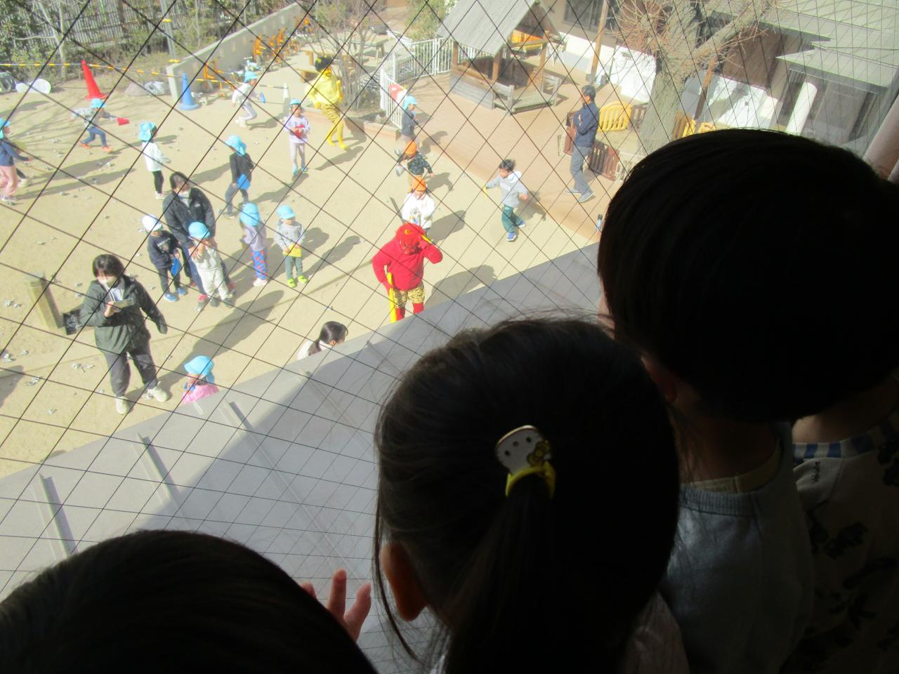 幼児クラスの子どもたちが一生懸命豆を投げて鬼退治をする姿を、廊下から「頑張れー!!」と応援していた子どもたちです。