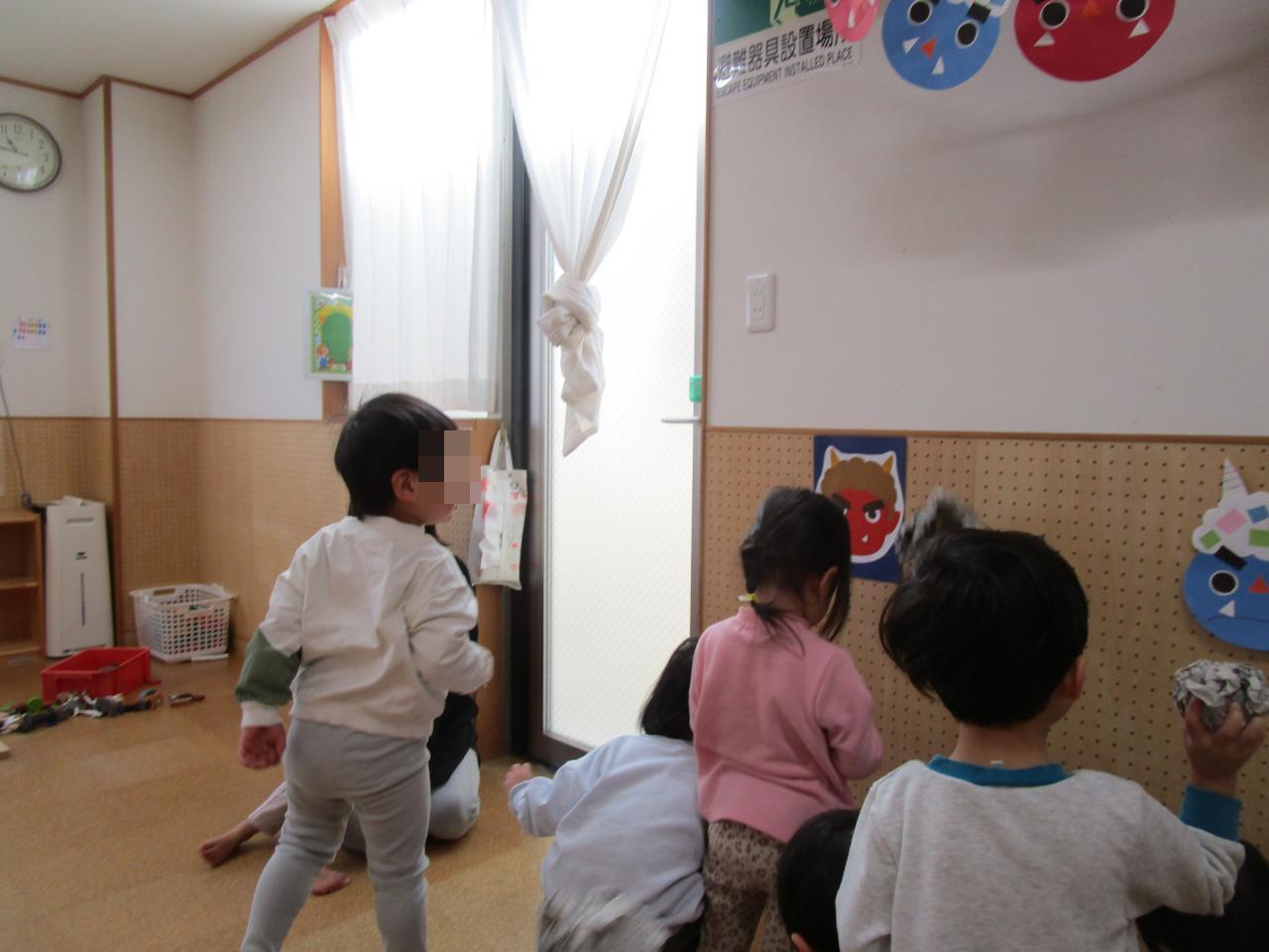 もも組は2日に新聞紙をちぎって丸めて豆を作り、お部屋の鬼に向かって「鬼は~外!福は~内!」と豆まきの練習をしました。