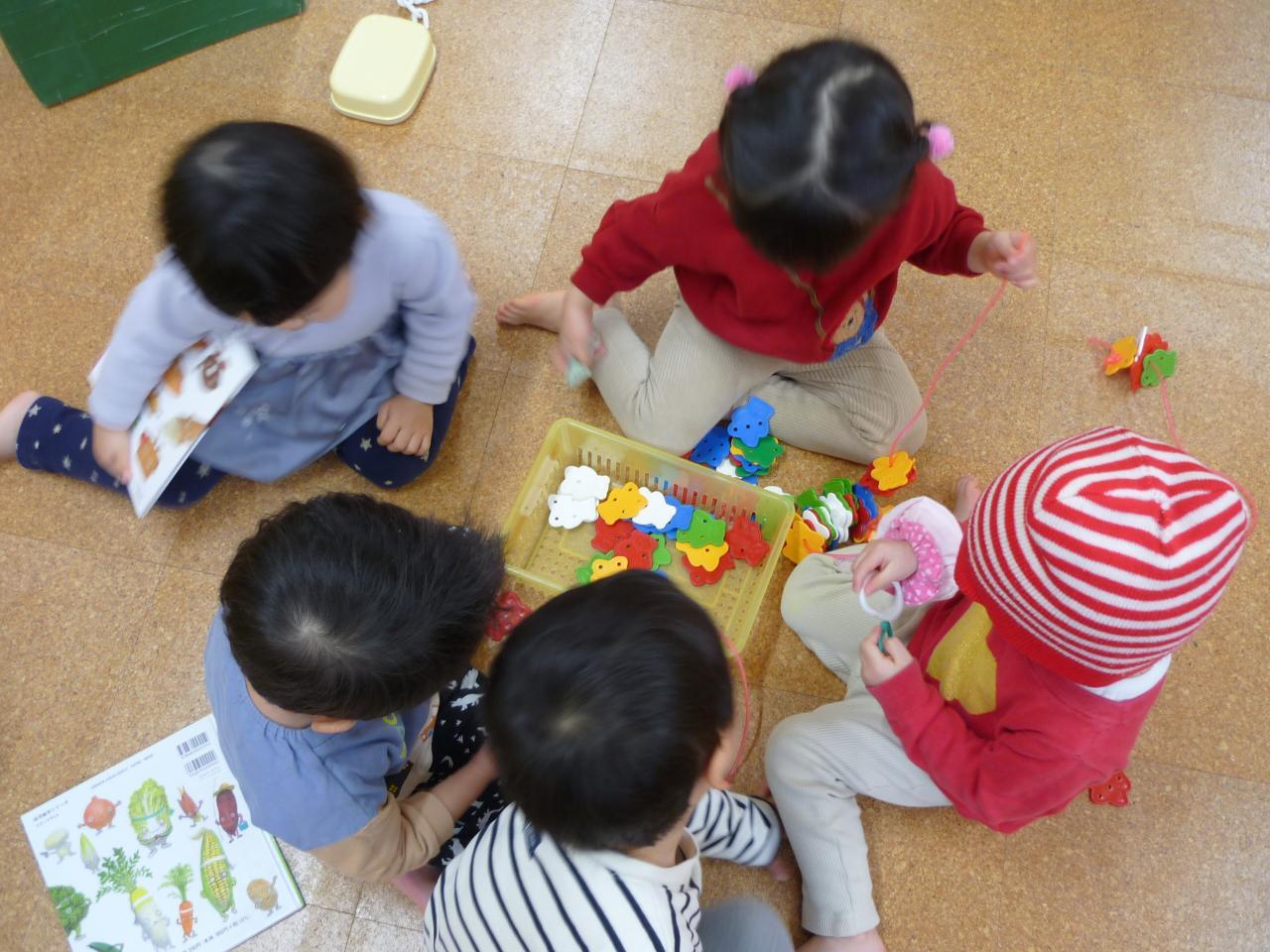 さて、最近の子どもたち、好きな遊び、好きな場所で一人遊びもしながら、お友だちと同じ事、同じ格好をして“一緒って楽しいね♪”という姿がたくさん見られるようになりました。その分おもちゃの取り合いになってしまうこともありますが、少しずつ「どうぞ」と譲ってあげることも学んでいるところです。このクラスで過ごすのもわずかとなってきましたが、まだまだ一緒にいっぱい遊んで、たくさん笑っていきたいと思います!!